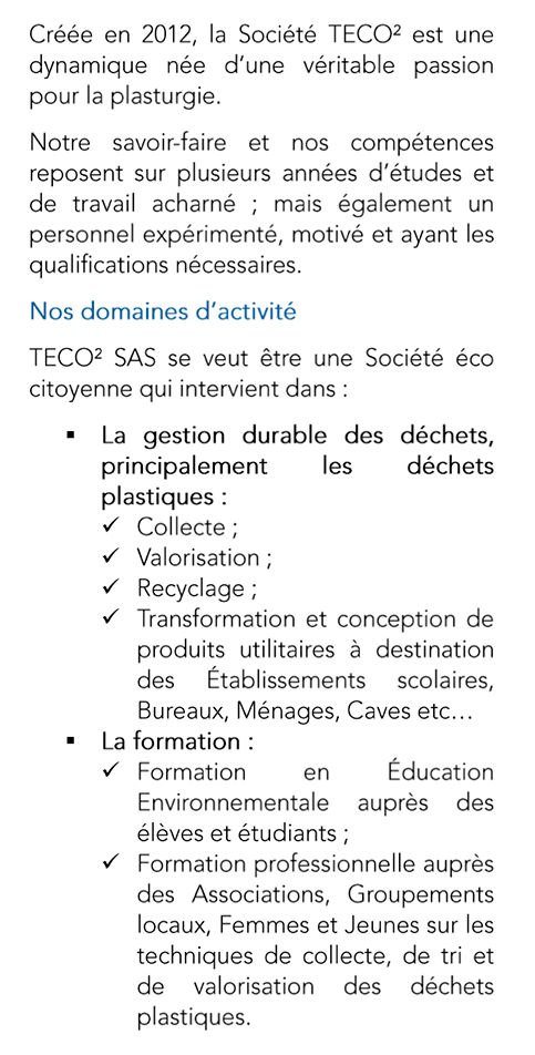 Créé en 2012, la société TECO² spécialisée en gestion durable des déchets, notamment les déchets plastiques, intervient principalement dans les pays suivants :