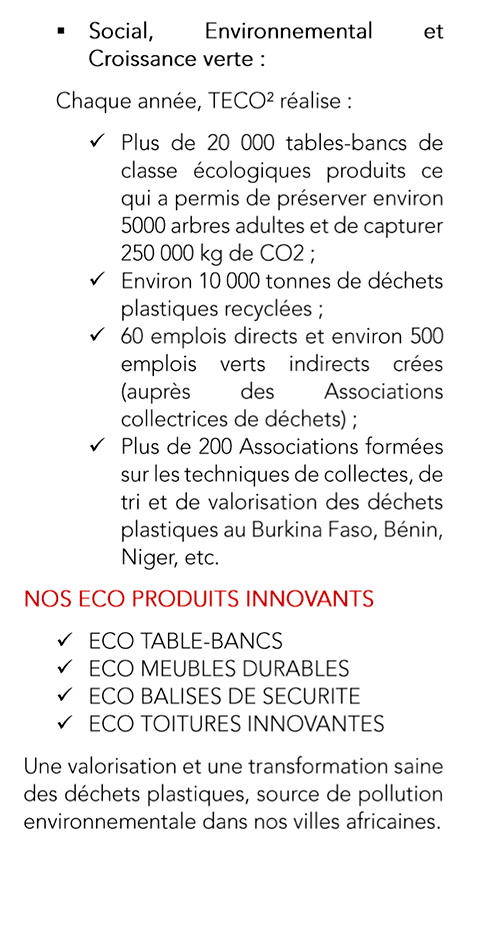 - Lauréat du 1er Prix du « Meilleur Projet en Assainissement et Valorisation des déchets » lors de la 2ème édition du forum Académie Nationale sur l’Economie Verte au Burkina Faso, Décembre 2023